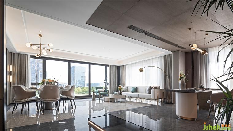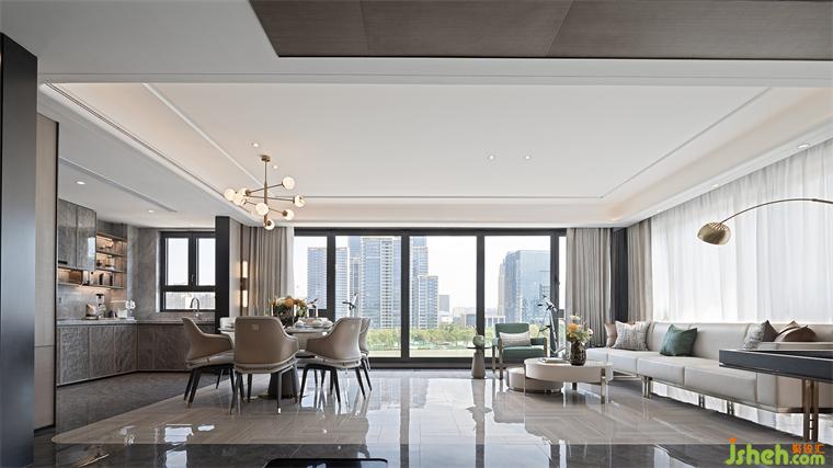 客廳布局打破常規(guī)的空間界限,樣板房設(shè)計強調(diào)空間線條感與生活功能性的思考,客廳、餐廳與工作區(qū)融合實現(xiàn)多場景對話打造生活空間,以連貫的手法和語言造型呈現(xiàn),向內(nèi)外延伸。開放式的格局,讓空間更為寬敞通透,營造舒展的氛圍。