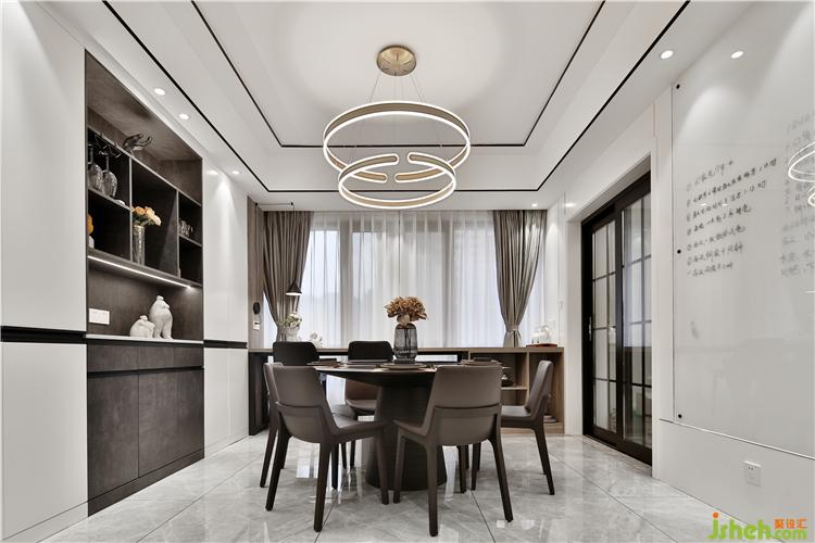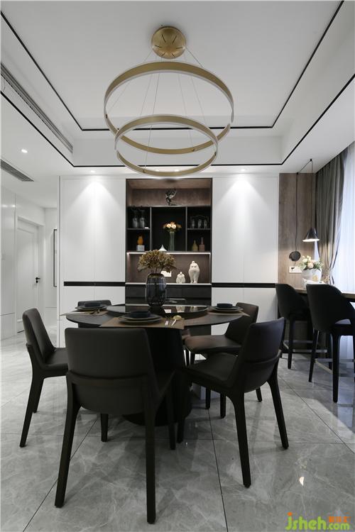餐廳里設(shè)計了一排頂天立地柜+敞開格柜,做到有藏有露出。