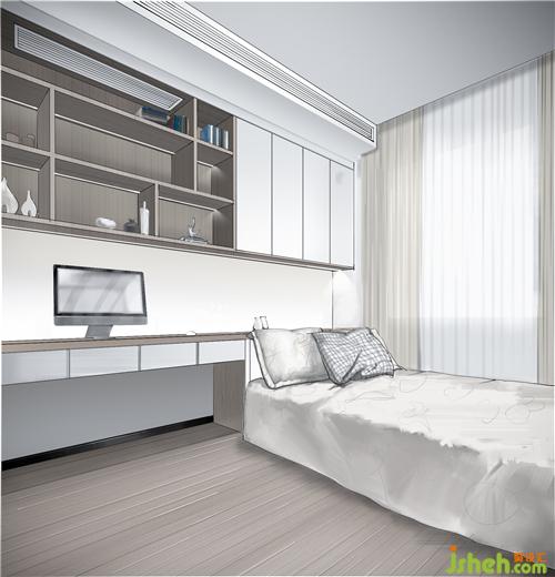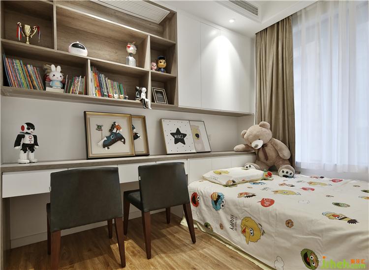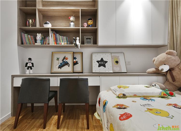 這是業(yè)主兒子的房間,書桌和書柜設計成一體式,書桌可以供兩個孩子一起寫作用,方便以后姐姐輔導弟弟學習。榻榻米是定制的。