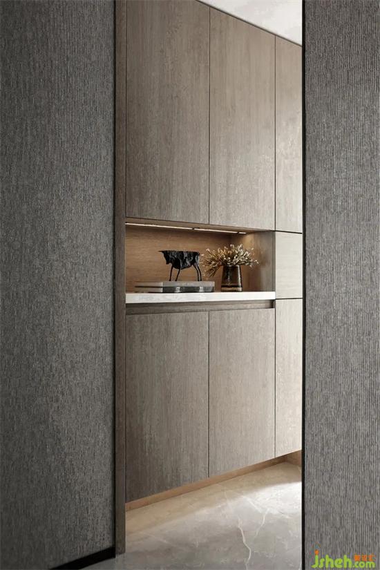 玄關(guān)是入門第一眼,是感受家庭氛圍最初的場所,要能令人一進(jìn)門,就感受到放松和平靜,我們主張此處的設(shè)計側(cè)重簡潔與溫馨。淺灰的木質(zhì)柜體在淡淡的燈光下顯得溫潤雅致,臺面上精巧的擺件則體現(xiàn)了主人對品質(zhì)生活的追求。深圳崗宏融湖居精裝提升樣板房設(shè)計簡潔的空間,傳達(dá)著精致減負(fù)的生活理念,不易使人急躁,對于繁冗的日常,簡單是生活的一門學(xué)科。