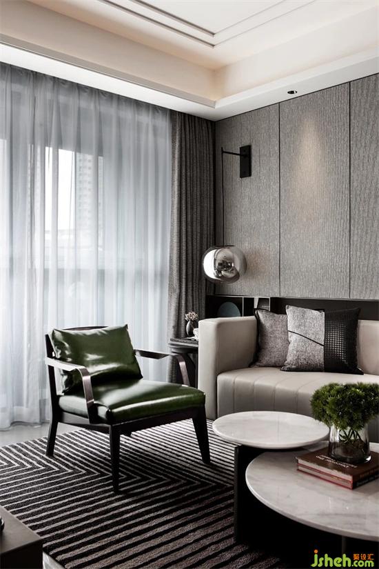沙發(fā)選用含蓄內(nèi)斂的淺色經(jīng)典款式,白而明亮的大理石茶幾臺面,透明花瓶中的簇狀綠植,工藝感十足的草綠色單人沙發(fā),深圳崗宏融湖居精裝提升樣板房設(shè)計從暗調(diào)背景中跳脫而出,成為空間的焦點,絲毫不覺得深沉壓抑,反而更顯清亮大氣。相愛的人依偎而坐,互訴衷腸,情意濃,心意通,是浪漫生活的正確打開方式。