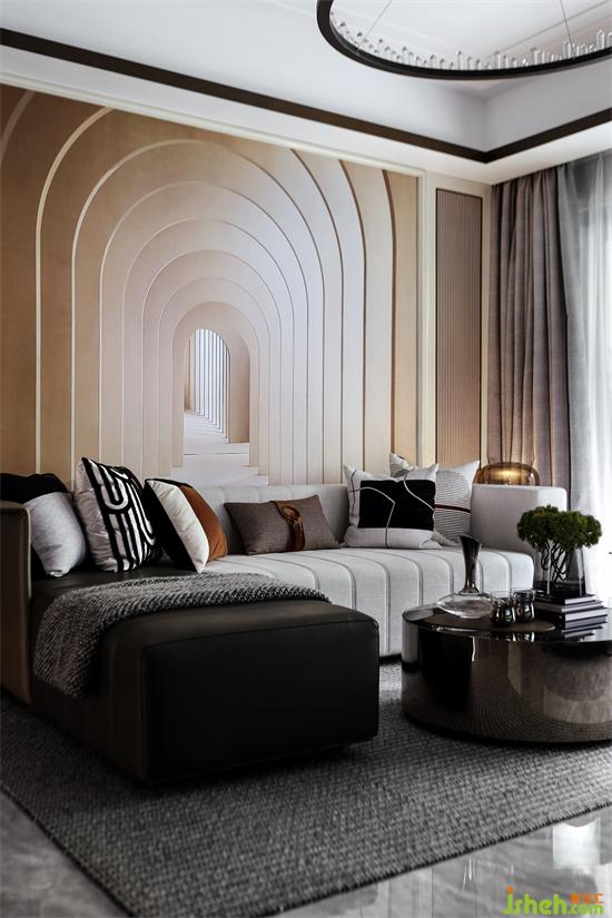 Model House C | 沙發(fā)背景墻細(xì)節(jié)重重疊加的拱形組合,以漸變橘配色,由淺到深,層層遞進(jìn),起到了延伸視覺的效果,弧線與直線交匯,流動(dòng)與利落,硬朗與柔和,相互碰撞,繼而交融。色彩與線條的結(jié)合,賦予空間多重的趣味和獨(dú)特的格調(diào)。