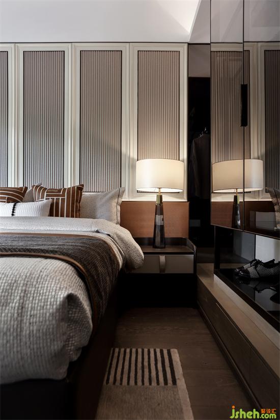 主臥背景墻延續(xù)客廳區(qū)域墻身的設(shè)計(jì),不同色彩與幾何元素的靈活運(yùn)用,廣州亞運(yùn)城精裝樣板房設(shè)計(jì)創(chuàng)造出恰到好處的空間層次,溫暖細(xì)膩的深色木地板,清透明亮的煙灰色玻璃衣柜,搭配質(zhì)感舒適的床品,于無形之中彰顯出主人尊貴的氣度。