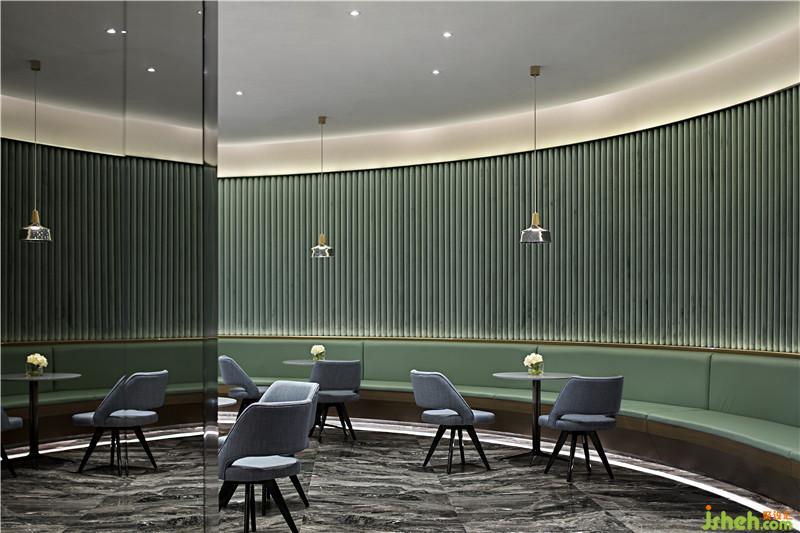 步入咖啡廳,設(shè)計師運用綠色與藍(lán)色,隱喻山與海,在現(xiàn)代建筑中營造自然的氛圍。舒適田園是掙脫現(xiàn)實的一畝良田,喚醒人們對生活本真面貌的追求。室內(nèi)設(shè)計師