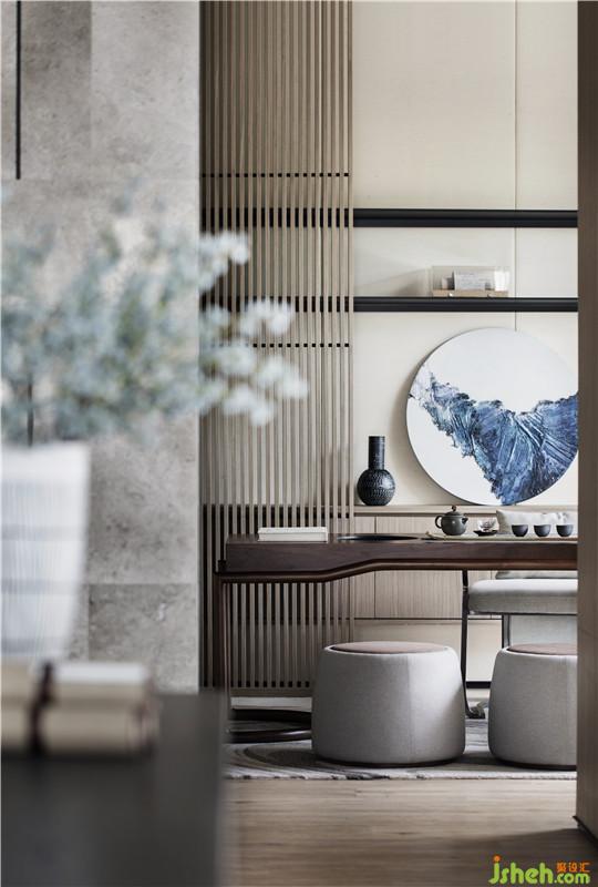 茶室與書畫廳構(gòu)成了相互貫通的空間格局,闡述了“茶通六藝”的中式哲學(xué)。通過石與木的相互銜接,仿佛將空間也進行了理性和感性的切割。室內(nèi)的中式家具與窗外的草色春光阻隔了外界的塵囂,在此靜心品茗一盞,給心靈以慰藉。