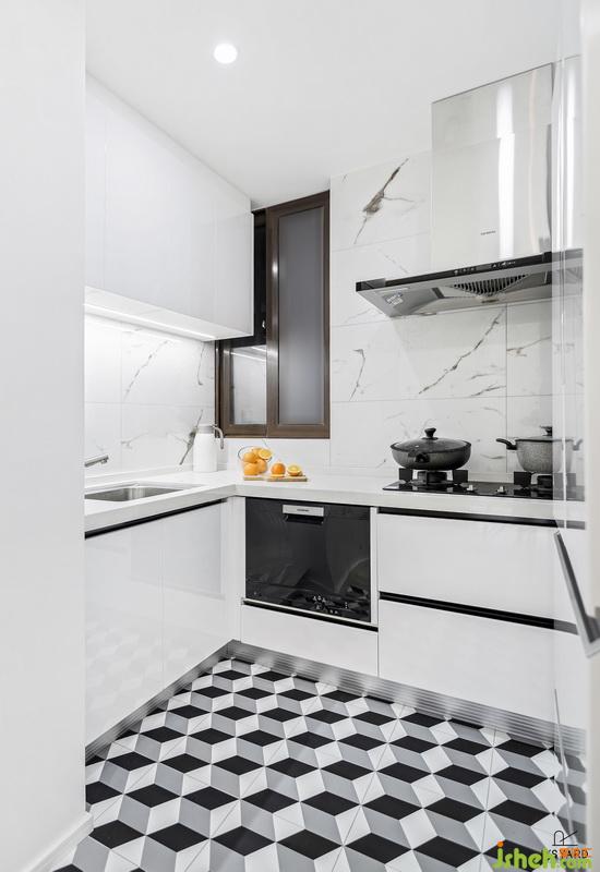廚房我們同樣以白色為主色調(diào),黑色線條做點(diǎn)綴,配上地面的幾何花紋,時(shí)尚且酷。