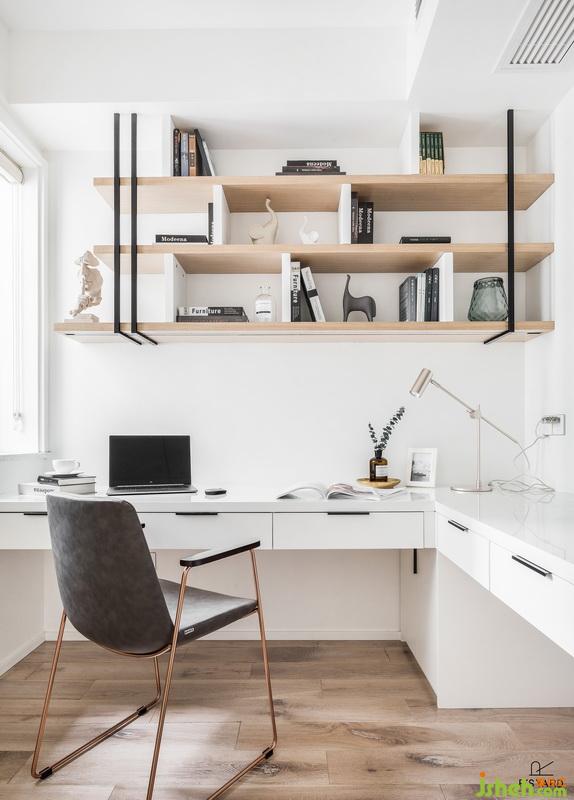 為了滿足夫妻兩同時(shí)使用書桌辦公的需求, 我們做了一個(gè)“7字型”加長版書桌。書架層板室內(nèi)設(shè)計(jì)師用木飾面層板加白色烤漆立板和黑色不銹鋼壓條的混搭,讓整個(gè)空間不顯單調(diào)。