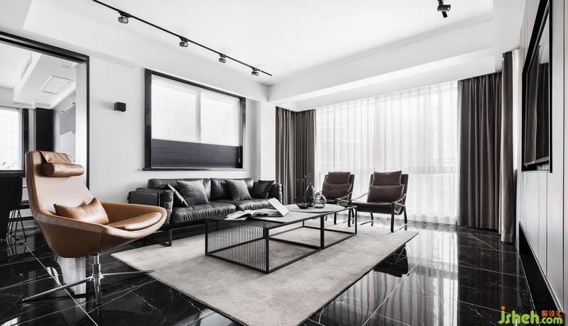 吊頂及墻面沒有做過多其他修飾,而是運(yùn)用軌道燈及黑色壁燈增加了黑色元素,強(qiáng)調(diào)黑白之間的極致碰撞,從視覺上賦予空間隨意灑脫。地面選用了黑色調(diào)大理石瓷磚,黑色搭配閃耀棕,光澤度上佳,細(xì)看之下猶如茫茫黑夜中一輪銀河閃動(dòng),呈現(xiàn)驚艷的鏡面效果。而米色的地毯的選擇在一定程度上也緩和了黑色的冰冷。黃卡其色單人沙發(fā),起到了不錯(cuò)的點(diǎn)綴效果。