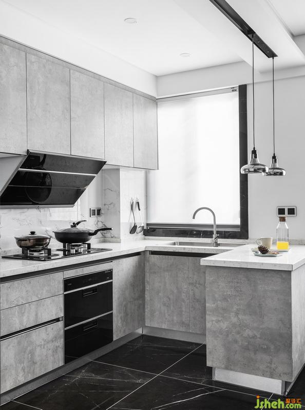 材質(zhì)對(duì)空間質(zhì)感的影響也不容小覷,我們放棄了烤漆櫥柜,轉(zhuǎn)而采用啞光色的水泥灰?guī)r板。水泥灰具有極強(qiáng)的表現(xiàn)力,它的粗獷嚴(yán)肅結(jié)合光澤靈動(dòng)的白色墻面瓷磚,不同材質(zhì)的融合與碰撞讓空間明凈且具有超強(qiáng)的質(zhì)感。