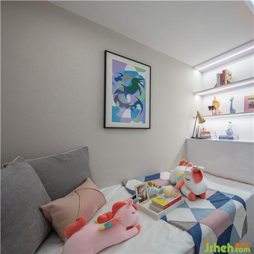 柜板中間加以明亮燈光,為整體空間增加采光度,簡(jiǎn)約而明快。萌趣裝飾畫、可愛玩偶和粉色抱枕等飾品共同營(yíng)造了一個(gè)童真又溫馨的小世界。