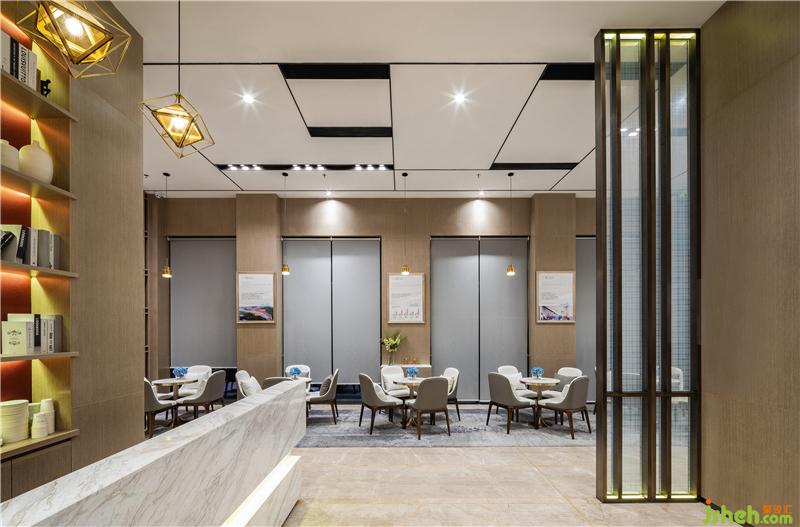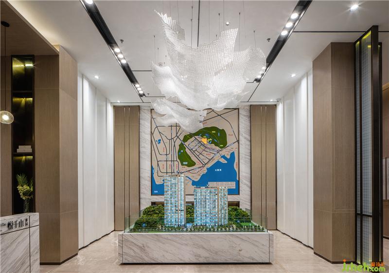 售樓處設計師結(jié)合當?shù)亟5奶厣崛×藵O網(wǎng)作為吊飾的設計元素,抬頭一瞬,仿佛可以體會到漁夫撒網(wǎng)那一刻對收獲的渴望之情,恰似來賓到此所含的期許心情,以及對未來美好生活的憧憬。