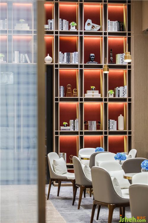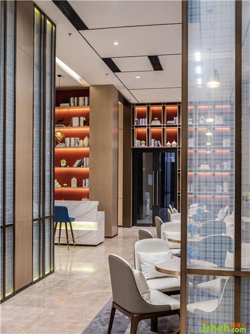 深色木飾面映襯之下,是擺放有序的白色桌椅、艷麗的綠植,以及以中國紅色調(diào)作為背景板顏色的裝飾柜,深淺得當,張力十足,駐足其中,為來賓帶來悠閑舒適的體驗。