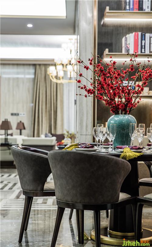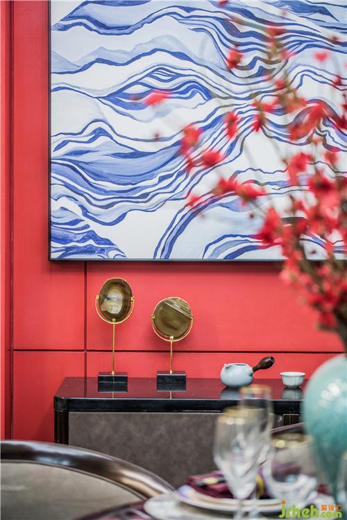 一隅的餐廳布局簡(jiǎn)約,格調(diào)高雅。一幅縹緲的寶藍(lán)水墨畫(huà),樣板房設(shè)計(jì)與紛繁的梅花藝品和仿古銅鏡互融交錯(cuò),加上印記灰大理石和軟包等現(xiàn)代材質(zhì)的注入,流暢地表達(dá)出傳統(tǒng)韻味,亦將現(xiàn)代審美展露無(wú)遺。