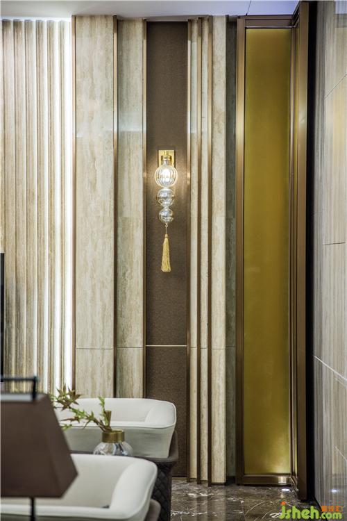 主要用材:印記灰大理石、瑞吉木紋大理石、胡桃木飾面、玫瑰金不銹鋼、墻布