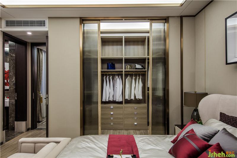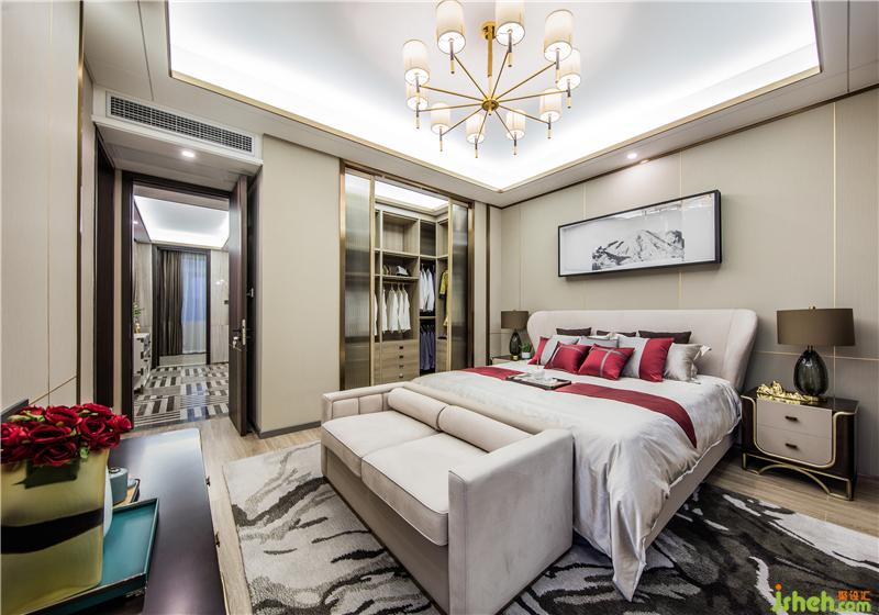 移步主臥,米白色床品與古典紅抱枕,呈現(xiàn)雅致柔和之感,木制衣柜間配以玫瑰金線條,樣板房設(shè)計(jì)體現(xiàn)空間的簡(jiǎn)約和低奢。水墨渲染的地毯,與床頭上方的寫意山峰婉轉(zhuǎn)呼應(yīng),盡顯詩(shī)畫(huà)美感,提升了居住環(huán)境的品味。