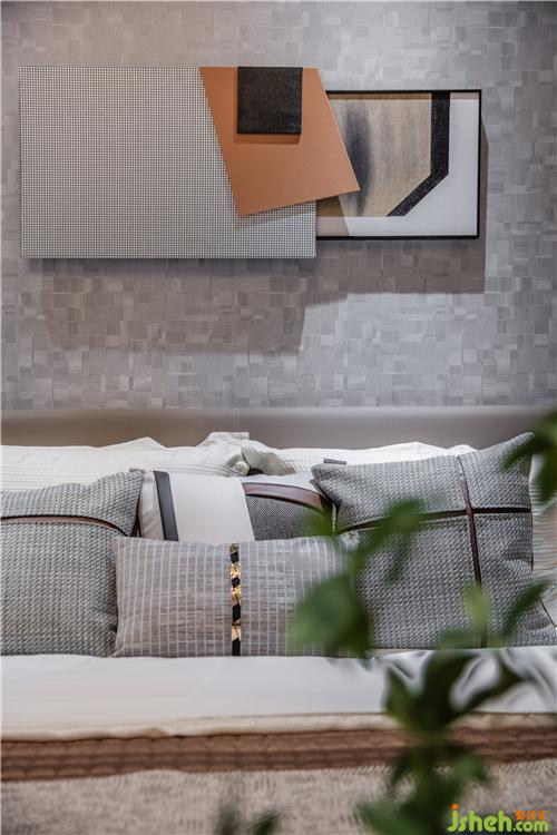 在主臥中,設(shè)計(jì)師用米灰色為主色調(diào)搭配胡桃木色家具,低調(diào)而內(nèi)斂,床頭一幅拼接的藝術(shù)掛畫(huà),用純粹的對(duì)比色塊,理性的線條勾勒出空間的力量美感。