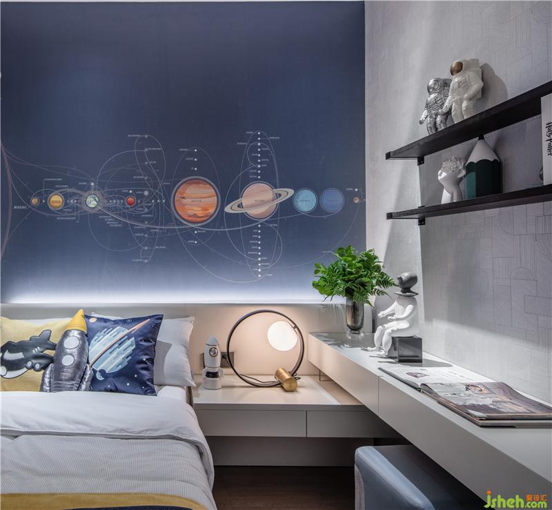 星空、火箭和宇航員,這是專(zhuān)門(mén)為具有夢(mèng)想成為宇宙飛行員的小主人精心打造的,從抱枕、陳列品到燈具、到房間壁紙的選擇,設(shè)計(jì)師為小主人打造了一個(gè)浩瀚的宇宙空間。
