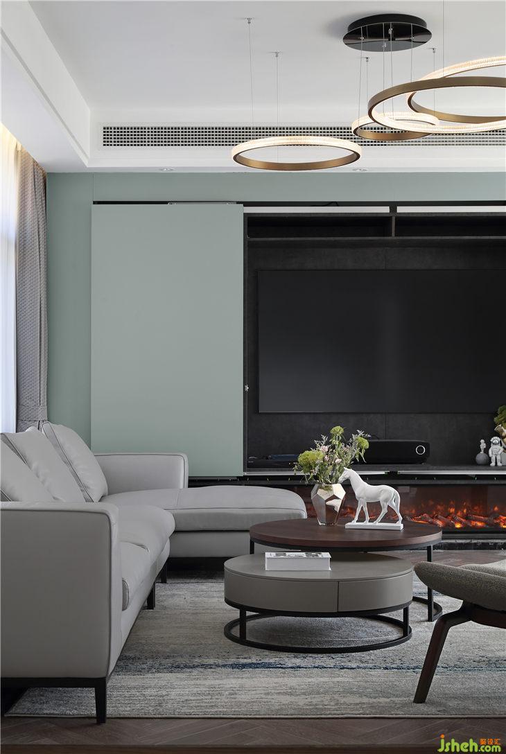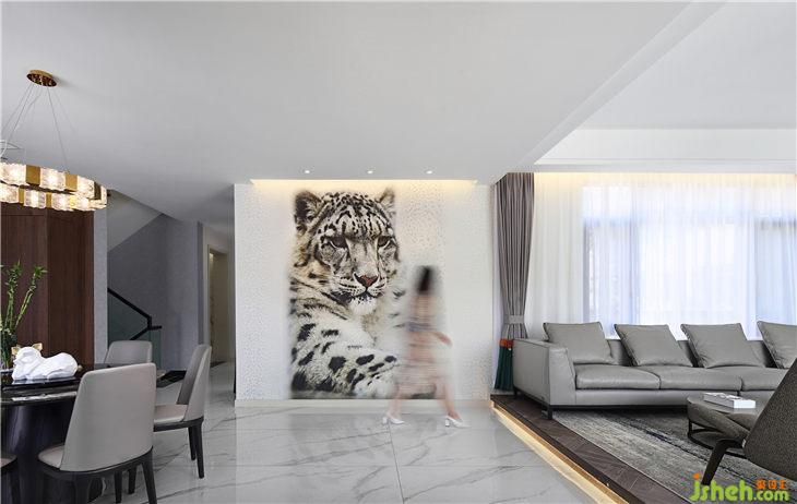 門廳的小豹子,是花了很長(zhǎng)時(shí)間的才選到的,讓整個(gè)空間靈氣了許多并又可愛了些許。往左邊上地臺(tái)就是客廳,正面隱藏式組合柜為空間整理出一個(gè)十分簡(jiǎn)約干凈的畫面,為了讓整個(gè)空間干凈清爽,我尋找了一種類似于巴士門的五金件,讓組合柜是全自動(dòng)的高科技,輕輕按下,家庭影院的就藏在里面。跟別人不一樣的背景墻,因?yàn)槲覀兊谋尘笆顷柟?。茶桌背后的大落地窗,讓陽光肆無忌憚地撞進(jìn)來。讓她窩在沙發(fā)里,聽窗外的花草淺唱。