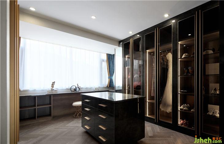 選擇的深色衣帽間的門板鑲嵌著金屬和玻璃,這三種材質(zhì)混合著微光,讓空間散發(fā)魅力。