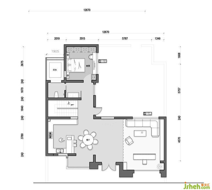 我對屋子進行了最簡單的劃分,沒有什么復(fù)雜的結(jié)構(gòu)改造,將客廳區(qū)域變成非固定式的場景,餐廳和開放式廚房形成整體。二樓給了她一個夢想的套間形式,衣帽間,衛(wèi)生間及主臥室占據(jù)了整個屋子采光最好的南面二樓,遠(yuǎn)處就是老山。