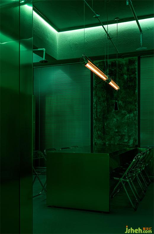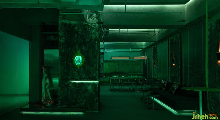 在跟J.MARS深度交流后,我們雙方都一致認為傳統(tǒng)的前臺并不是剛需,近晴設計團隊用“街頭的方式”來解決“街頭的問題”,我們從街頭的電線桿得到靈感,街舞工作室設計用“電線桿式”的立吞吧臺來滿足倚靠、背靠、操作筆記本、手機等功能。噴涂銀色金屬漆的棕櫚樹、紫黃漸變的亞克力魔方、科技感的鐳射布、破爛的水泥墻面……近晴設計以低成本的設計手段去平衡和融合西海岸的HIP-HOP精神文化與當下潮流審美之間的關系。