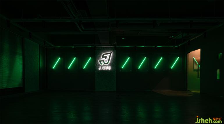 門頭的體塊之間呈現(xiàn)出來的虛實關系,不單是滿足讓學員有記憶點,更旨在引發(fā)新來學員的好奇和探索欲。街舞工作室設計項目是在寫字樓里面,這一層的商戶也是由辦公為主,整體環(huán)境是很商務的,根本讓人聯(lián)想不到HIP-HOP文化、自由、律動、創(chuàng)意,所以門上方的懸浮燈箱和門廳的發(fā)光亞克力條凳都是旨在用光去調動來客的情緒轉換。