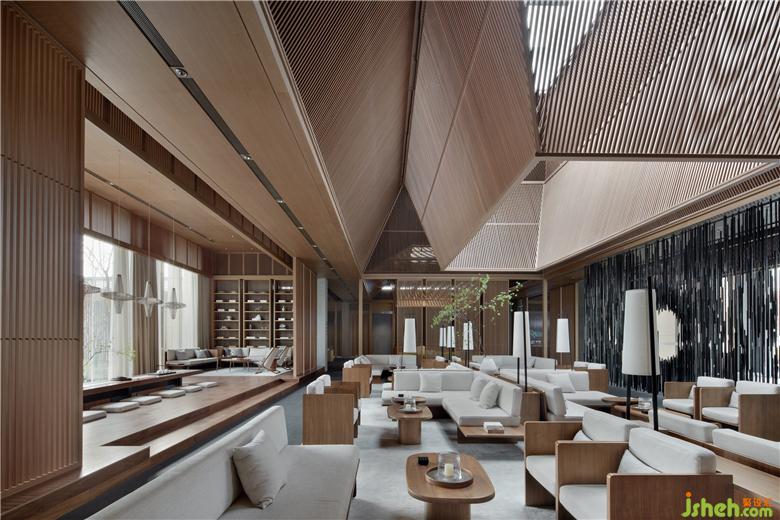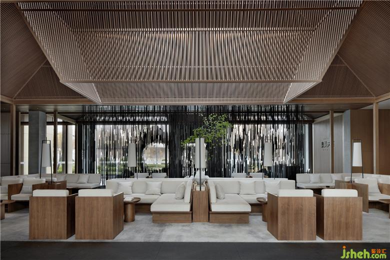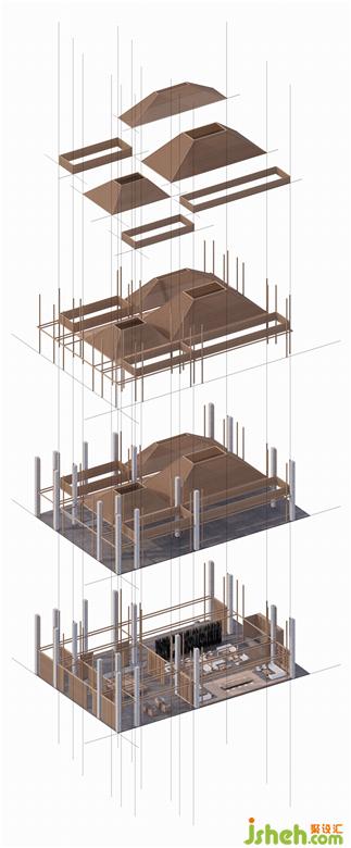 構(gòu)架的頂部吸收并運用了中國古典殿閣與井亭的“盝頂”建筑造型樣式,形成四角上揚收合的形態(tài),凸顯出生命氣息與能量聚合的理念,同時在聚合的頂部留出可呼吸的天窗氣口,充分地吸納天地靈氣和流轉(zhuǎn)的太陽光線。從而形成“舍”的傾斜式頂部結(jié)構(gòu)部分?!氨J頂”的運用,產(chǎn)生出高低起伏、聚合離散的空間節(jié)奏,也營造出林泉丘壑、山野幽僻的悠遠意境。