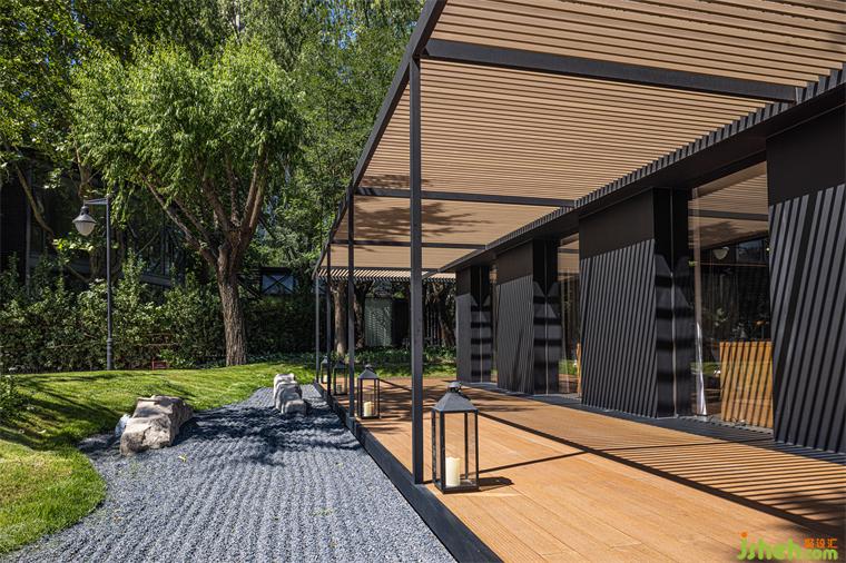 由于原建筑與室外環(huán)境直接相連,又因地勢陷落而困頓突兀,茶空間設(shè)計(jì)以建筑為核心,將周圍景觀向外推離4米,并向下挖掘與建筑齊平,形成一條在外部環(huán)繞的過渡帶,將公共區(qū)域與主建筑柔軟相隔。建筑則向外延伸出2米地臺,對應(yīng)立面條形窗圍合木格柵連廊,茶座散落。