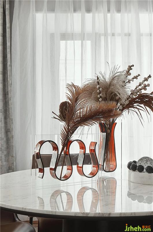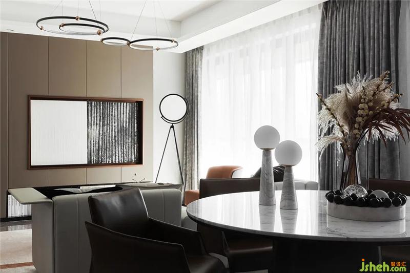 設(shè)計(jì)在空間質(zhì)感上精雕細(xì)琢,突顯居者的品味與個(gè)性。樣板房設(shè)計(jì)圓形大理石餐桌與深棕皮革餐椅,別致的幾何裝飾與花藝的點(diǎn)綴,為追求精奢生活的都市菁英,構(gòu)筑充滿儀式感的空間氛圍,從物質(zhì)層面到精神層面,匹配其深層次的美學(xué)品味與生活格調(diào)。