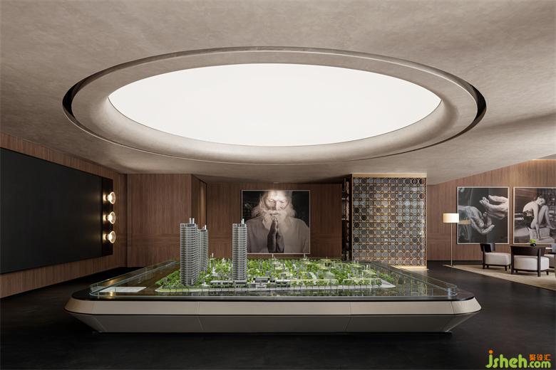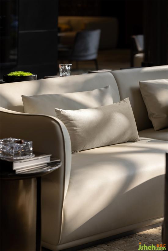 吧臺(tái)一側(cè)的洽談區(qū)軟裝,整體采用與吧臺(tái)相反的淺色調(diào)。售樓處設(shè)計(jì)米白色的沙發(fā)、地毯、茶幾臺(tái)面、落地?zé)?,搭配頂面的弧形線條,共同詮釋著空間中的舒適優(yōu)雅的氛圍。