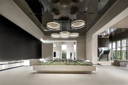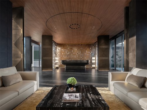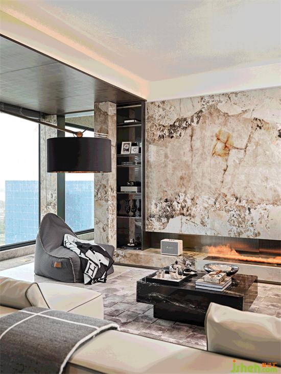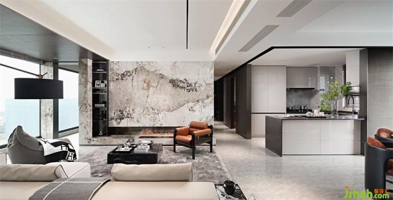 大面積暖色花紋的石材,結(jié)合四周簡潔流暢的線條裝飾和中性調(diào)的樣板間設(shè)計家具軟裝,和諧而不繁復(fù)。墻面底部的漂浮結(jié)構(gòu)減去石材墻面的體量感,愛馬仕橙的軟裝點綴增添輕盈明快的優(yōu)雅氣質(zhì)。