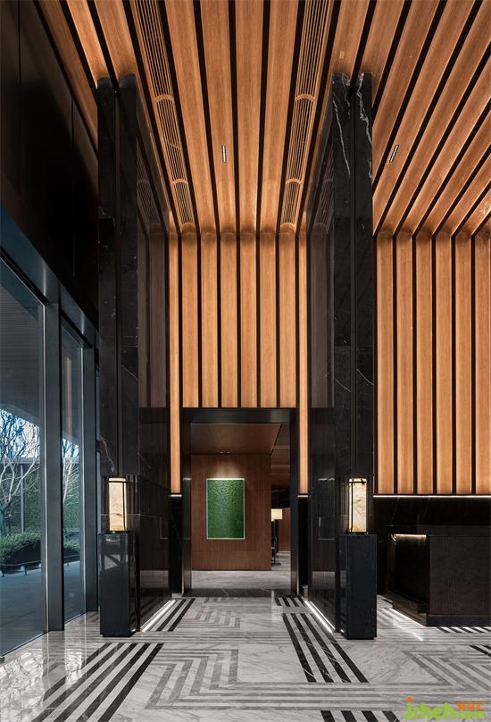 黑白線條交錯的地磚,交替組合的圓形與方形元素,既延續(xù)并重構(gòu)了寶格麗的經(jīng)典圖案,也為大堂整體深色的空間里增添了活躍的層次感,以寶格麗低調(diào)、質(zhì)感的設(shè)計之形建構(gòu)尊貴、舒朗的內(nèi)在體驗及售樓處設(shè)計感受。