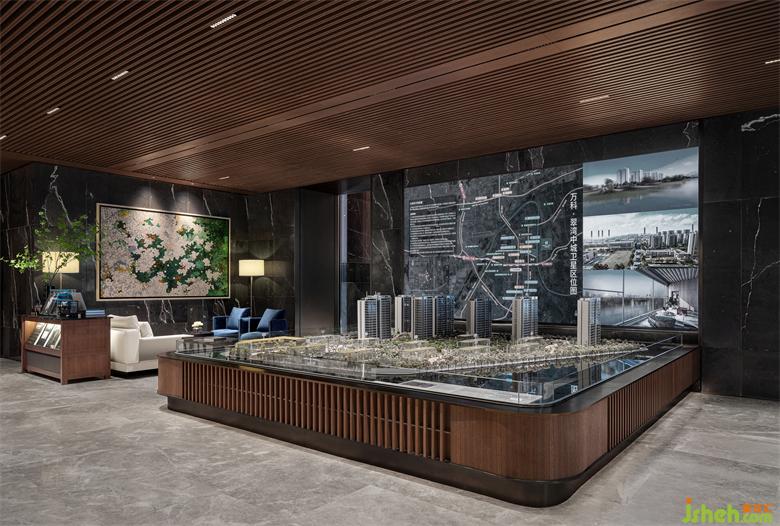 相較于高挑的大廳,降低天頂高度的沙盤區(qū)和洽談區(qū),給予更溫馨舒適的氛圍體驗(yàn)。開放式的沙盤,四周的圓弧設(shè)計(jì),既提供一個(gè)售樓處設(shè)計(jì)更為人性化的交流互動(dòng)空間,同時(shí)也引導(dǎo)了整個(gè)空間的動(dòng)線。