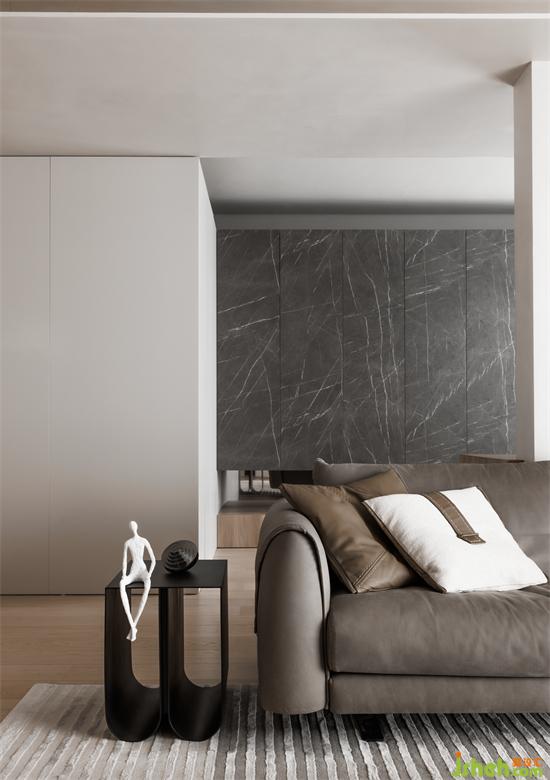 當(dāng)空間重組之后,除了空間更加開闊之外,視覺上也大氣了很多。吊頂采用不銹鋼流線型設(shè)計,間接拉伸了空間層高,也增加了柔軟度。家裝設(shè)計電視背景墻電視部分用黑色巖板做區(qū)分,后側(cè)用鏡面形成穿插結(jié)構(gòu),使整個背景富有層次感。