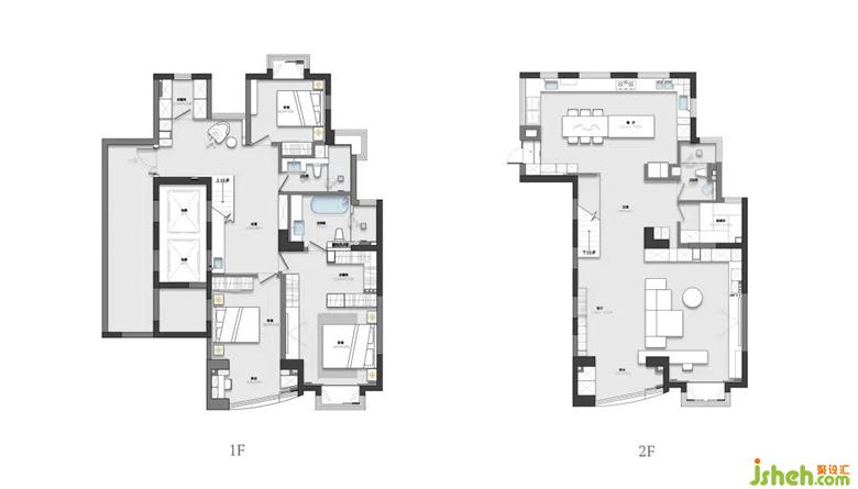 一層原始是公共區(qū)域,考慮到兩個業(yè)主都是律師,會經(jīng)常加班,所以調換一、二層的功能,將臥室區(qū)域放于一層,方便回家后能直接進入到自己的私密空間。整個二層一分為二,一側是以客廳休閑為主,另一側則圍繞餐廳廚房展開?;Q功能后,二層原始墻體都過于封閉,家裝設計需要打開墻體重新規(guī)劃成一個通透的空間。這樣既方便了生活動線,又在空間上形成了交互互通,不同功能區(qū)域之間彼此獨立,又有著貫通的流動感。