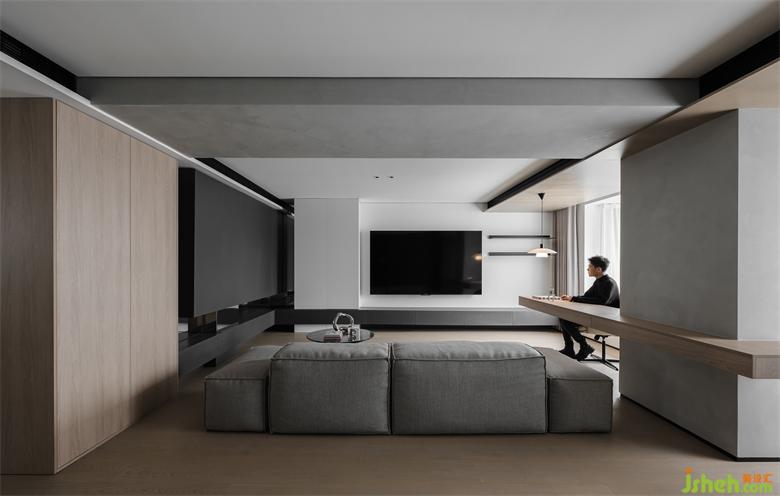 整體空間以經(jīng)典黑白灰加以原木色為主題配色 。Living Divani 的定制款沙發(fā)是整個區(qū)域的核心,搭配十二時慢的藝術感茶幾,呈現(xiàn)出鮮明有力的表現(xiàn)力,主宰了空間的第一印象。黑色、木色不同紋理的門板搭配上鏡面給人帶來的呼吸感,家裝設計不規(guī)則的設計中又有著規(guī)則的舒適度。收納功能也在隱形中得到了提升。