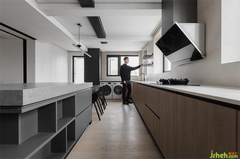 相比餐廚分離式設計,廚房里融入餐廳設計,中西廚可同時烹飪,就餐一氣呵成,優(yōu)化了動線的同時也有了大平層的寬闊感。收納型島臺連接餐桌,家裝設計將儲物與就餐完美結合。U字形的操作臺面與之相結合的下柜,收納空間的提升肉眼可見,摒棄壓縮空間的上柜,在墻面處安置兩個置物架,帶給空間的是輕盈舒適感。