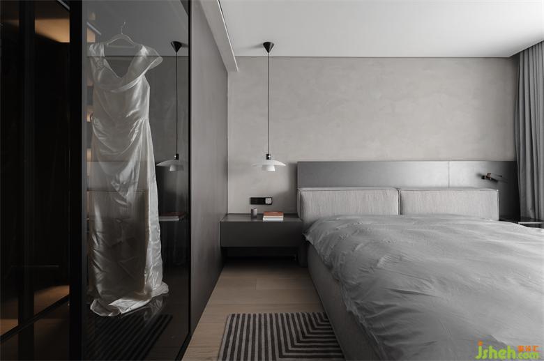 主臥套間在低調與時尚之間尋找平衡,是最具溫度與儀式感的存在。家裝設計進入主臥就能看到設計別致的開放式U型衣帽間,一件高定禮服懸掛于黑色透明區(qū),高級感油然而生。定制的 Ditre Italia 床,床背板連接一側床頭柜,在上面安裝一盞床頭燈,在低飽和度灰調的鋪敘下,帶來了微妙而柔和的空間敘述。