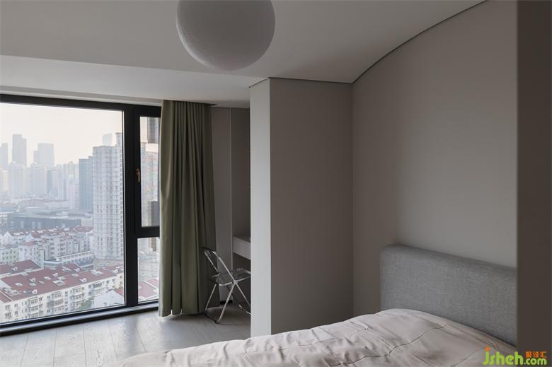 次臥選用暖色系為主,純粹的墻體沒有過多的設計,給予空間更多的自由。家裝設計弧形的吊頂與球形燈給臥室?guī)チ巳彳洝?