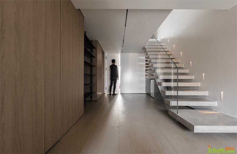 一層空間全部采用隱形門設計,顏值與高級共存,放大空間的同時讓家在視覺上整體性更強,也可以讓家中仿佛多出來一個“秘密”空間,讓空間充滿趣味。樓梯采用鋼架結構,上附木板,扶手則采用玻璃材質,踏步間的縫隙與玻璃的透明感保持了視覺上的純凈大氣。感應腳燈也給予了上下樓足夠的光源與安全感。
