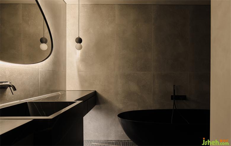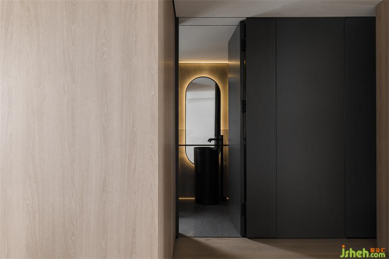 隱形門打開后,直入眼簾的黑色水磨石一體式獨立盆,美觀高級。家裝設計橢圓形鏡面背后的燈帶給衛(wèi)生間賦予了一層神秘面紗,氛圍感十足。