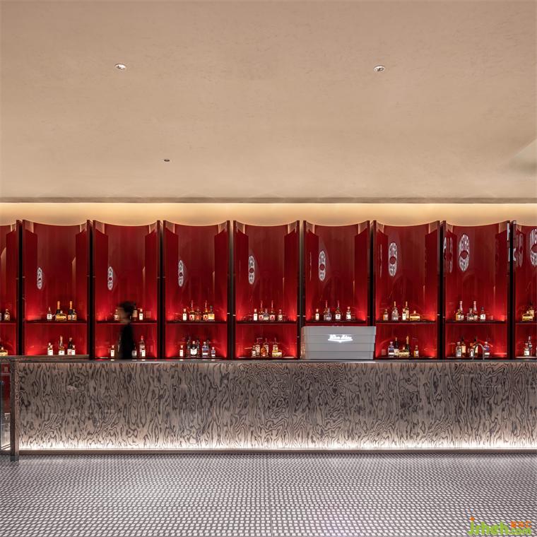 作為楊浦工業(yè)銹帶中最具特色的元素,“聯(lián)排筒倉”被以刨切的形式抽象化為空間中的城市記憶雕塑,海上和集設計并成為接待區(qū)和水吧區(qū)的超級符號。