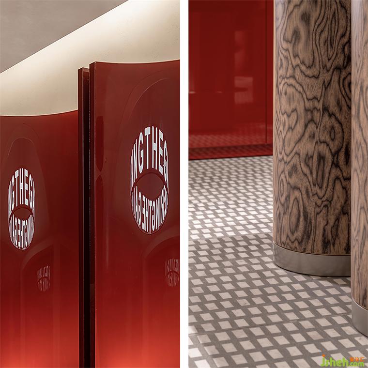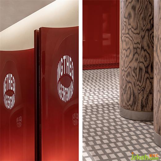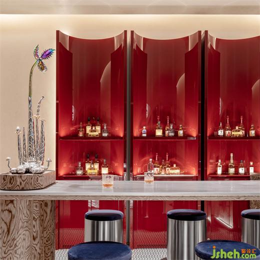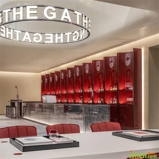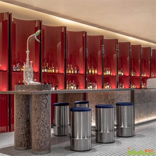 吧臺(tái)的木紋飾面被視為一種平面系統(tǒng),猶如咖啡與酒水的兩色交融,在視覺上與空間早C晚A的功能相呼應(yīng)。吧凳的設(shè)計(jì)靈感來自于工業(yè)管道?!吨厣?永生花》裝置來自藝術(shù)家張藝法,隱喻著楊浦濱江從“工業(yè)銹帶”到“生活秀場(chǎng)”的更迭現(xiàn)象。