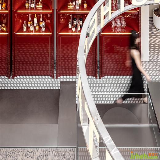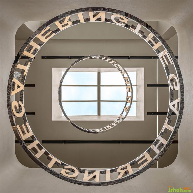 設(shè)計(jì)師在一層和二層之間創(chuàng)建了一個(gè)和樓板一體的曲面扶手作為聯(lián)通,海上和集設(shè)計(jì)像是一個(gè)工業(yè)煙囪穿插在樓板之間。巨大的燈光裝置則猶如工業(yè)作業(yè)中白煙,以螺旋形飄向天空,而風(fēng)塑造了燈的造型,輕輕搖曳,宛如天和地、歷史與未來的連接體。