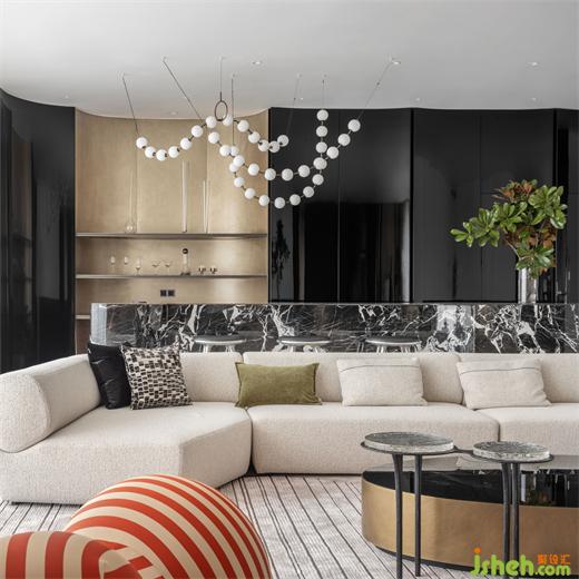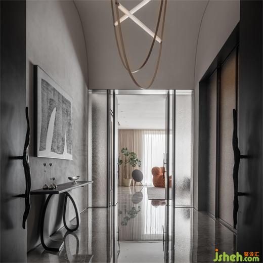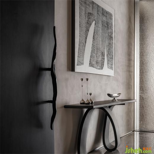 黑色雙門被開啟的瞬間,便仿若進入了神秘主義的畫卷中——挑高的穹頂劃出一雙弧線,籠罩出玄關的所在,立體線條的長案之上擺放著Michael Aram托盤和Klong Tender水滴燭臺,自然元素、古老手作和時尚主義的細節(jié),私人別墅裝修設計透露著居家的品調。