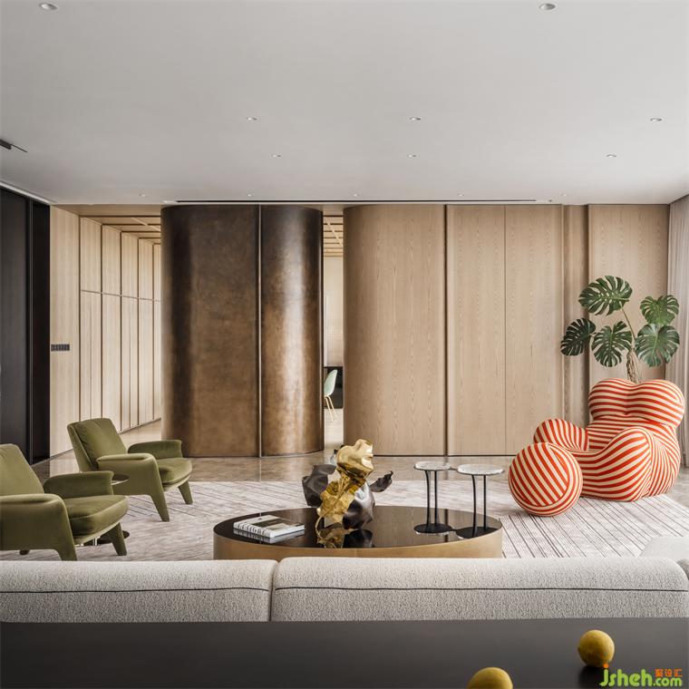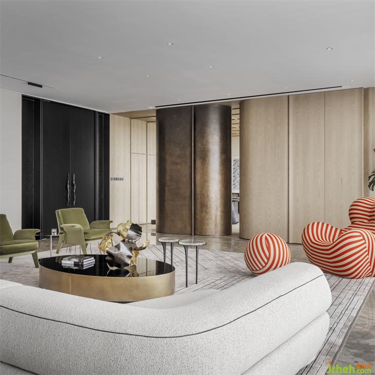 走廊的一側(cè)是獨(dú)立衣帽間的入口,橢圓天花設(shè)計(jì)與弧形擱架,在呼應(yīng)間層層延展開來,溫柔的大地色配以BAXTER毛絨座椅,營(yíng)造華麗松弛的質(zhì)感。