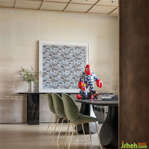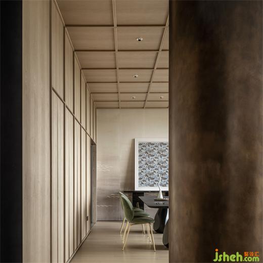 細(xì)致的家宅空間,如音樂般富有節(jié)奏韻律,有聚合之地更有靜處方所。在休閑區(qū)與茶室之間,私人別墅裝修設(shè)計師插入藝術(shù)金屬體塊將兩個功能區(qū)分隔開來,圓弧之上,作有凹凸的線條,仿若雕塑,而體塊背面又兼具著書架的實用功能。
