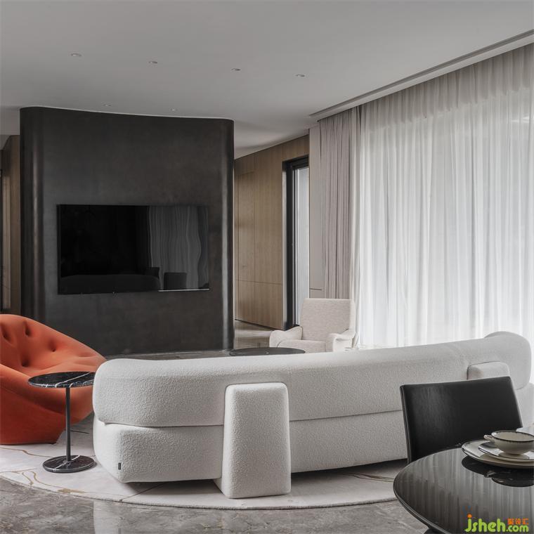 上行一層,抵達(dá)家中的客餐廳,米灰色系為主調(diào),圓形地毯與茶幾圍出親密聚合的意味。Gogan系列長沙發(fā)來自MOROSO,現(xiàn)代感流線設(shè)計與CASSINA單人座椅相應(yīng)和,如同柔軟的雕塑,輕盈有型。私人別墅裝修設(shè)計而Ligne Roset沙發(fā)卻以橘色宣告?zhèn)€性,鳥巢般的造型更平添舒適質(zhì)感。此間MOROSO的金色三腳邊幾以不規(guī)則拼接元素凸顯出自然形態(tài)與設(shè)計美學(xué)的結(jié)合,趣致盎然。Tom Dixon的香氛,更讓家中空氣有跡可循,捕捉五感開啟的確幸。