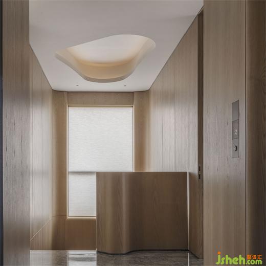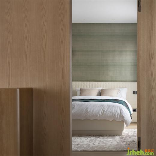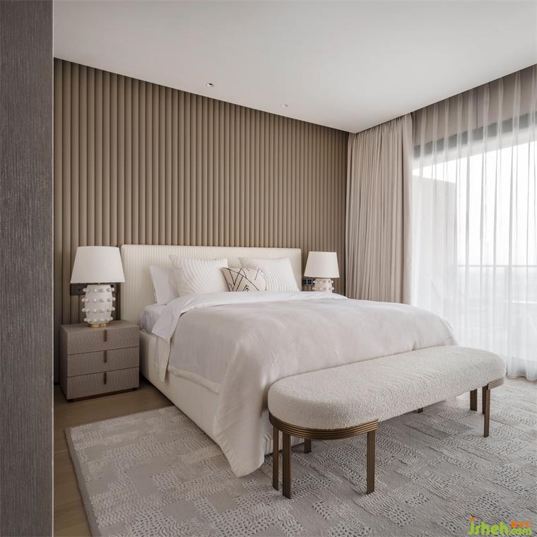 行至二層是臥房區(qū)域,木與白色的主臥空間,頗有美學(xué)中“見白非白,私人別墅裝修設(shè)計白由心生”的境界。立體起伏的背景墻面配以Kelly Wearstler臺燈,底座的雕刻亦在有趣與精致之間形成詼諧對比。