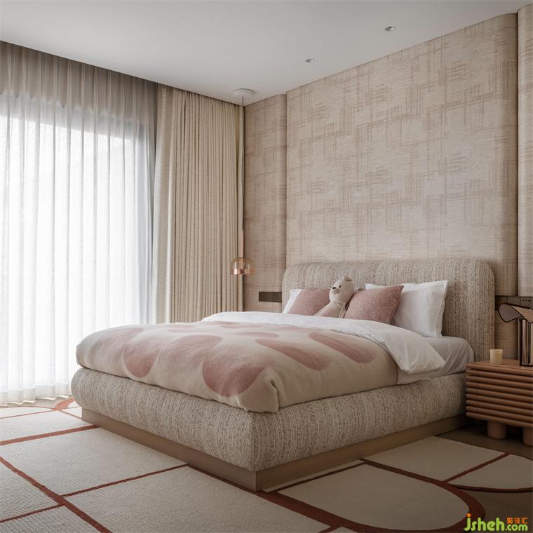 女兒房被賦予煙熏粉色的調(diào)子,漸變圖案、溫暖織物、方格地毯、Flos臺燈,以及&TRADITION單人休閑椅,造型靈感來自天鵝收起翅膀的瞬間,這一切都讓時光柔軟細膩起來。